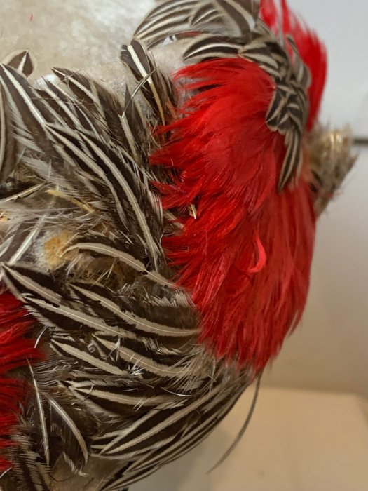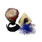 de eerste is gemaakt van veren en fluweel, de tweede is gemaakt van canvas en een bosje raffia en katoen, het label is "Vogue", een oude Napolitaanse hoedenmaakster, de derde blauwe is niet van de periode, kan later zijn na verloop van tijd bestaat het uit een sluier met een kam die op de haren zit, de laatste zwarte is van fluweel, veren en twee knopen.