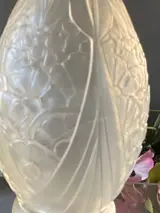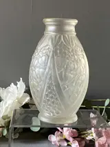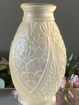 Mooie vaas van Joma, Frankrijk. Gemaakt in de periode 1920-1930. Het is geperst glas, niet doorzichtig. Het motief zijn allemaal in elkaar geschoven bloemen. Aan de onderkant gemerkt met Joma en 'Frabication Francaise'. (gemaakt in Frankrijk). Mooie kleine vaaas.