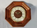 Een wijzerplaat achter een bol glas in een messing behuizing.