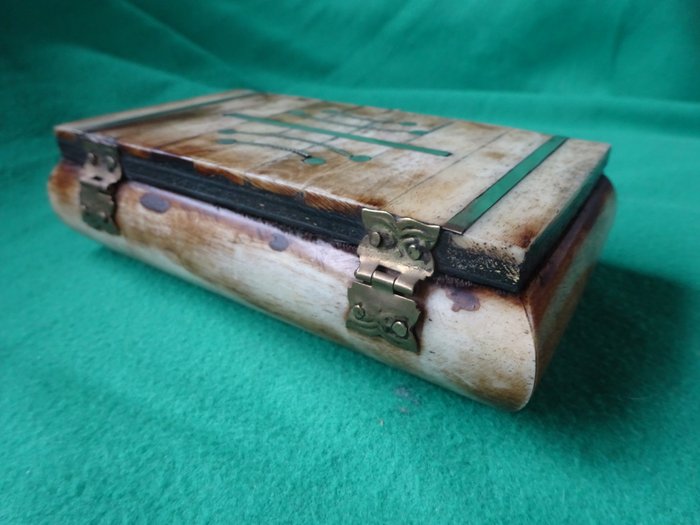 Benen Juwelendoosje met ingelegd koper decor. Scharnier en sluiting uitgevoerd in messing.