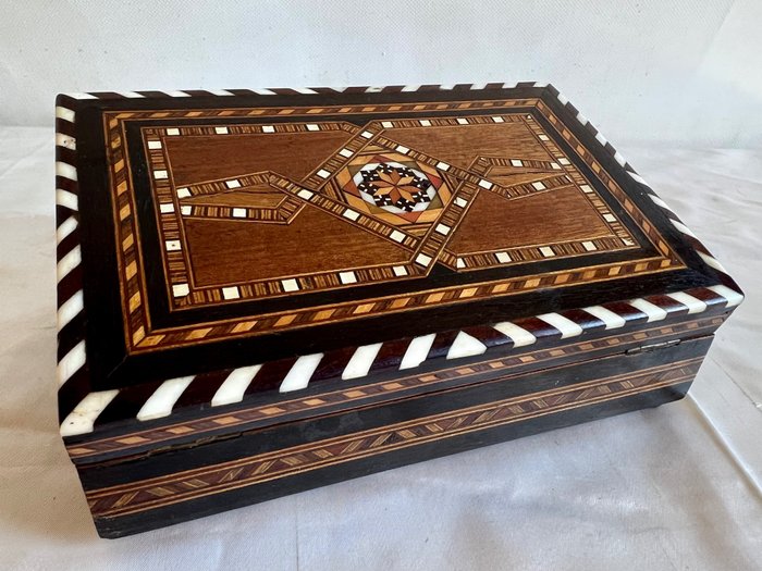 Juwelier- Grenadine Taracea Doos Originele houten kist met inlegwerk en handgemaakte beenrand. De bovenkant en zijkanten zijn versierd met een fantastisch geometrisch patroon met meerdere tonen en vormen van hout.Het heeft twee koperen scharnieren die het deksel aan de achterkant vasthouden. Fantastische doos om sieraden, speciale voorwerpen zoals liefdesbriefjes in op te bergen.