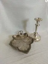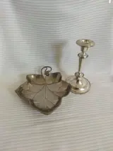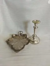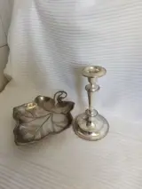 Brievenhouder in Verzilverd in de vorm van een klimopblad, Made in Italy, lengte 23 cm, breedte 20 cm en hoogte 4 cm. Verzilverde kandelaar, lengte 19 cm, diameter 10 cm, in uitstekende staat met lichte tekenen van oxidatie. Verzending per koerier.