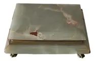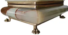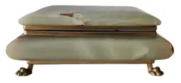 Grote juwelendoos met scharnierend deksel en geheel uitgevoerd in onyxmarmer met prachtige adering en messing leeuwenpoten. Het kan ook worden gebruikt voor speelkaarten. Onyx heeft een scala aan levendige kleuren van jadegroen tot cacaobruin met oranjegele aders