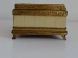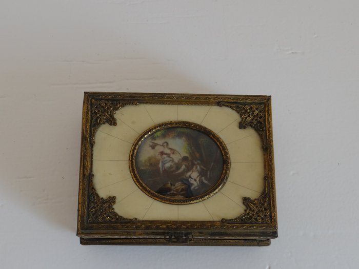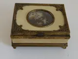 Halverwege de 20e eeuw faux ivoren juwelendoos, verfraaid met een miniatuur op het deksel, waarschijnlijk met de hand geschilderd op een bakelieten plaat