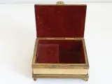 De doos is gemaakt van imitatie-ivoor, dat ivoor vervangt door cellulose, verpulverd bot en hars te mengen. De kist is versierd met applicaties van gegoten en gebeiteld en opengewerkt messing. Exterieur in goede staat; het met zijde gevoerde broekje vertoont op één plek gebruikssporen zoals te zien op de foto's. Het met fluweel beklede interieur is in goede staat.