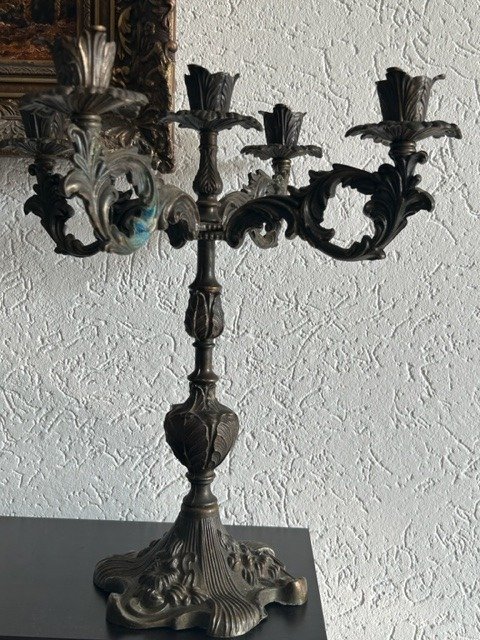 Bronzen kandelaar waarvan de bolvormige schacht vier gebogen armen ondersteunt en een centrale arm met motieven van bladeren, bloemen en bladeren.