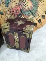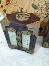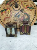 twee prachtige kasten met lades in jadehout en messing plus een decoratieve paraplu met polygaam ontwerpen alles in goede staat