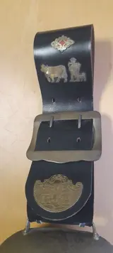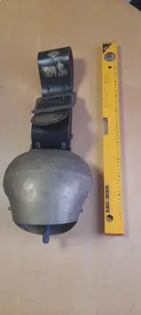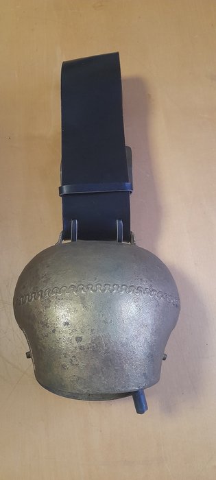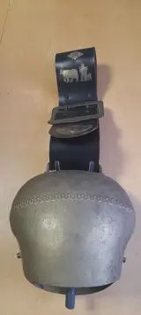 Een zeer grote oude koebel op leren band uit Zwitserland. Ik schat het dateren uit het midden van de 20e eeuw. De bel is handgemaakt van messing. Er zijn enkele mooie tekenen van veroudering. De band is in uitstekende staat, met een messing gesp en toegevoegde decoratieve messing accenten. De bel is in uitstekende staat.