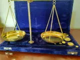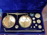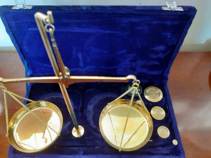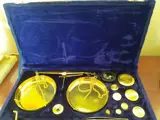 Koper goudweegschaaltje in originele velous etui compleet met alle gewichtjes en opschoefbare balans. In originele staat in uitstekende conditie.