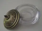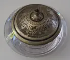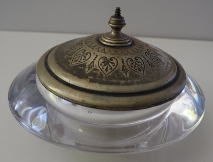 Kristallen pot met oude gegraveerde koperen deksel.