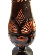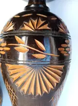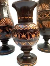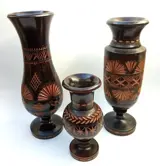 Set van drie houten vazen uit Kroatië, regio Split. Gemaakt van gedraaid hout, zwart gebeitst aan de buitenkant en later uitgesneden met geometrische vormen. Kroatië, jaren 80. Er verschijnen een of twee scheuren in het hout zelf.