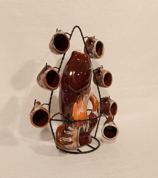 Aangeboden wordt een set van 8 kopjes en een kruik in de vorm van een vis, van keramiek.