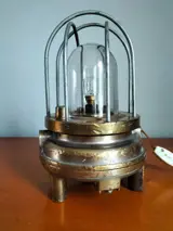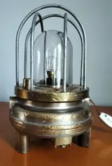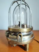 Bronzen mijnlamp die in de tijd werd omgevormd tot tafellamp.Deze lamp werkte dankzij perslucht... lucht kwam de lamp binnen en zette een turbine en een dynamo in werking die de energie produceerden die nodig was voor de lamp.