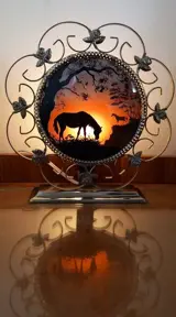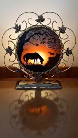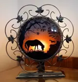 Vintage beschilderde staande lamp met paarden in een landschap met een messing lijst met kleine roosjes erin verwerkt. De voorkant en de achterkant zijn 2 bolvormige glazen beschilderd met paarden in een bos. Het lampje geeft een mooi 3D effect alsof de zon ondergaat.