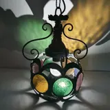 Hanglamp omgeven door gekleurd glas in lood. Metaal-glas-hout.