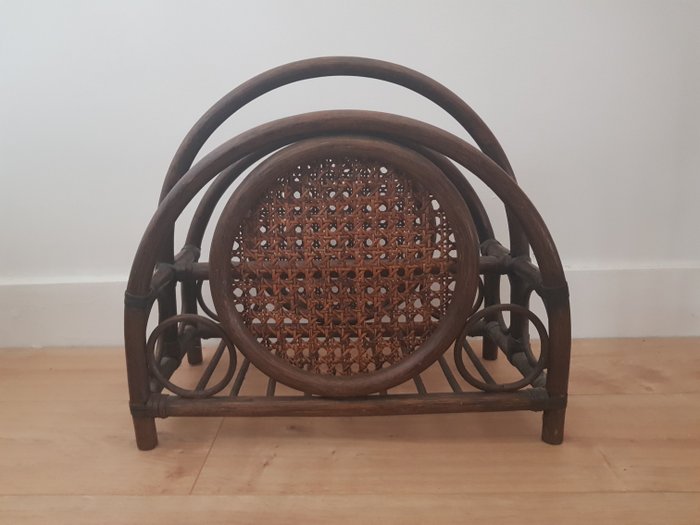 Fraai vormegeven donkerbruine lectuurbak, krantenbak van bamboe.