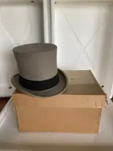 Een mooie hoge hoed van het merk Lock & Co Hatters London samen met de originele hoedendoos , dit model noemt de Ascot Top Hat en is tot op heden nog steeds verkrijgbaar.