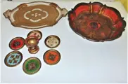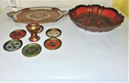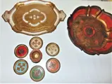 Lot van 9 Florentijnse objecten --- 1 Dienblad 44/29 cm, 1 Slakom 6,5 H: 34,5 cm, 6 Onderzetters 9 cm en 1 Eierdopje 8 H/7 cm, alles in zeer goede staat.