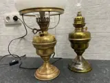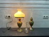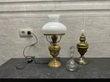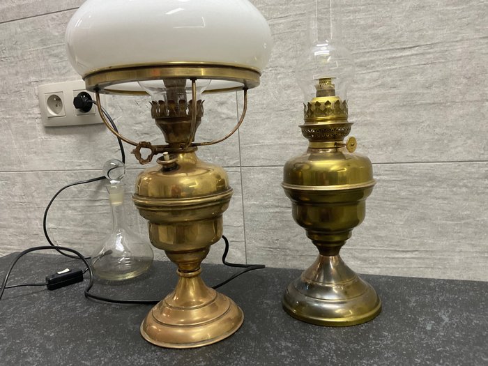 Lot van Koperen lamp met opaline kap / koperen olielamp en oude glazen karaf
