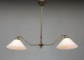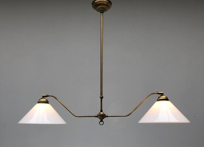 Mooie grote hanglamp gemaakt van gepatineerd messing met opaline glazen kappen. Geheel in Art Deco stijl.