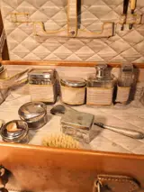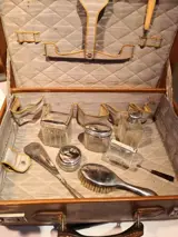 Beautycase uit de jaren 20/30 van leer? in goede staat, ondanks de leeftijd. Je moet de sluiting forceren maar hij sluit. Het aanbod omvat glazen potten voor verschillende cosmetica die werden gebruikt, borstel, schoenlepel met zilveren handvat om te lijmen. Italiaanse afkomst
