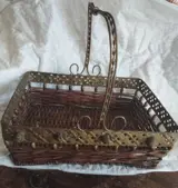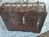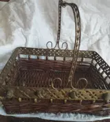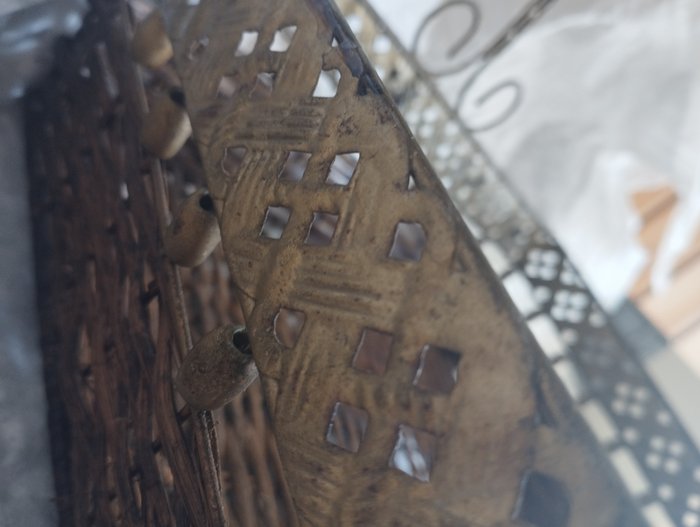 Rieten (houten) mand met bewerkte en geverfde ijzeren structuur versierd met schelpen en kleine houten kraaltjes