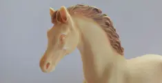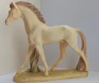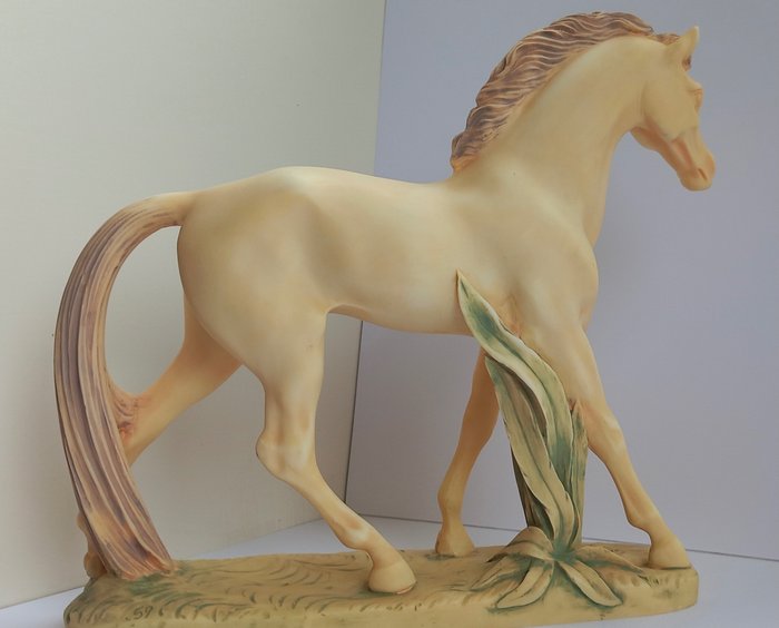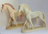 Twee paarden vervaardigd uit albastpoeder dat wordt gemengd met harsen en andere componenten en een zeer gladde en delicate afwerking biedt met fijne details.Gemaakt in Griekenland door kunstatelier Maska. De crèmekleurige is hand geschilderd en verder in goede staat. Onderkant staat een stempel handmade in Greece Maska. Het witte paard mist een stukje oor en staat iets scheef.