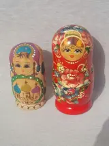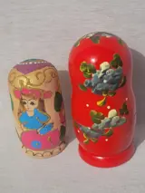 Twee matryoshkapoppen, van verschillende grootte. Elke pop is samengesteld uit 5 elementen (poppen).