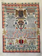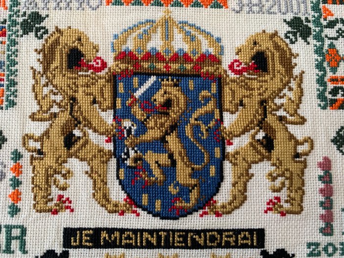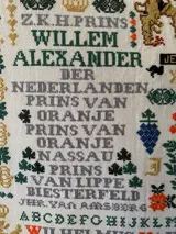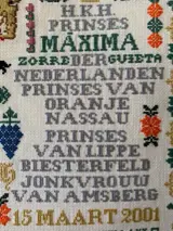 Deze Merklap is zéér fijn geborduurd op wit stramien, met hele kleine kruissteekjes en zit vol met kleine symbolen, te weten: de geboortejaren van Alexander en Maxima, de huwelijksdatum,