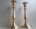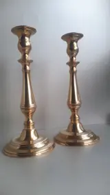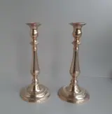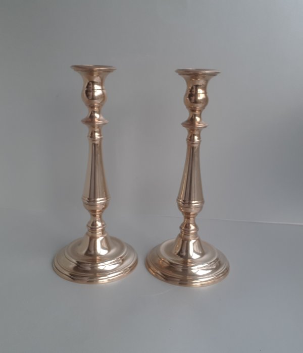 Twee mooie messing of koperen barokke kandelaars, gaaf en gereinigd. +/- 26 cm H en het gewicht van beiden samen is +/- 800 gram. Geschikt voor 2 cm brede kaarsen.