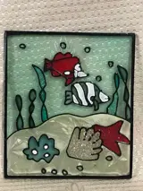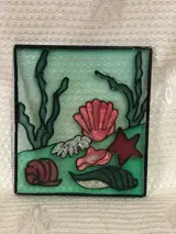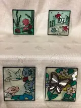 prachtige set van 4 miniatuur glas-in-loodramen die dieren of weekdieren voorstellen, allemaal geënsceneerd in zeer mooie kleuren met een ongelooflijke weergave met gedempte verlichting (zie foto's) vitrine objecten in goede staat, let op zeer kleine openingen zie foto's