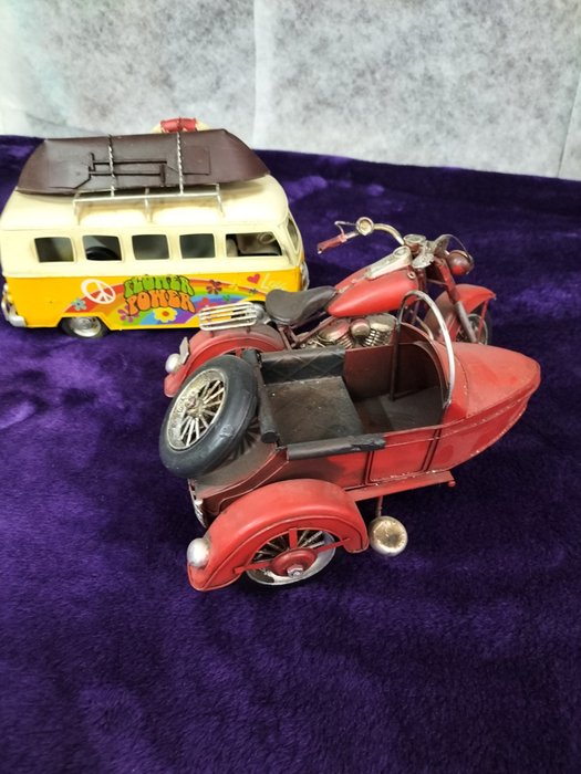 twee zeer grote mooie stukken, in metaal, een zijspan en een minivan.