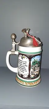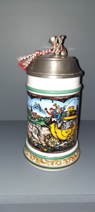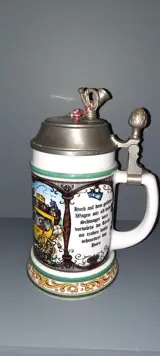 Vintage. Antieke BMF bierpul met tinnen deksel Zeer goede staat. Muziek Porseleinen bierpul. Opschrift op deksel Rein Zinn BMF W Germany. ER op het kleine plein (zie foto)