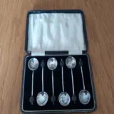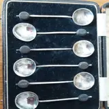 6 zilveren mokkalepels in hun etui, van Engelse origine, jaar 1907