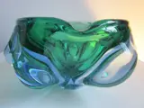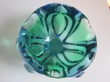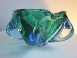 Grote schaal/asbak in prachtig in elkaar overvloeiende tinten blauw en groen. Het hoogtepunt van het maken van dergelijke voorwerpen in Murano waren de jaren '50 en '60 van de vorige eeuw. In uitstekende conditie, slechts enkele gebruikssporen op de standring. Hoogte 10 cm. Breedte 15 cm. Gewicht 1715 gram.