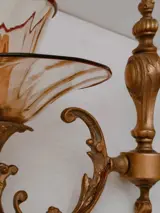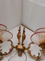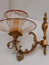 Prachtig paar bronzen wandlampen, met amberkleurige Murano glazen lamphouder met robijnrood profiel.Perfect