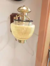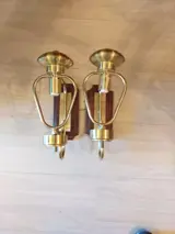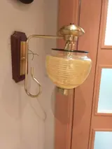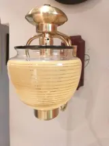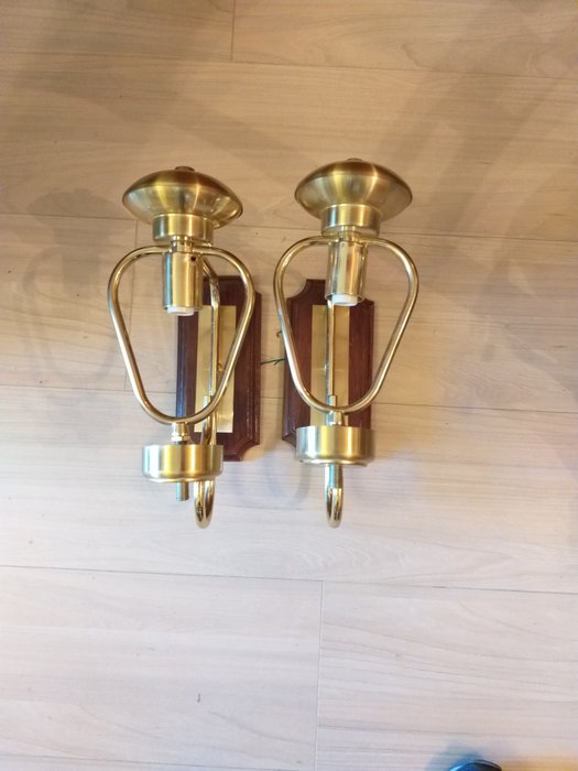 Paar wandlampen uit de jaren 70 in glas en verchroomd messing op een houten voet, afmeting 25 x 30, glascontour 50 cm, breedte van de uitmonding van het scherm 12 cm, de foto's maken deel uit van de beschrijving