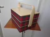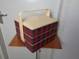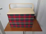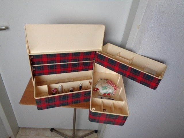 De box is onderverdeeld in 3 lagen met aan beide zijden 2 laden die naar buiten uitzwenken. Elke lade is onderverdeeld in diverse vakken. Ook de onderste bak heeft diverse vakken. De vakken zijn flexibel inzetbaar door de tussenschotten te verplaatsen naar eigen inzicht. De buitenkant is bekleed met stof in schotse ruit.