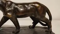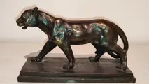 Een brede bronzen panter. Met signatuur 'Barye'. Gemaakt in de eerste helft van de 20e eeuw naar voorbeeld van het beeld van Antoine-Louis Barye (1796-1875).