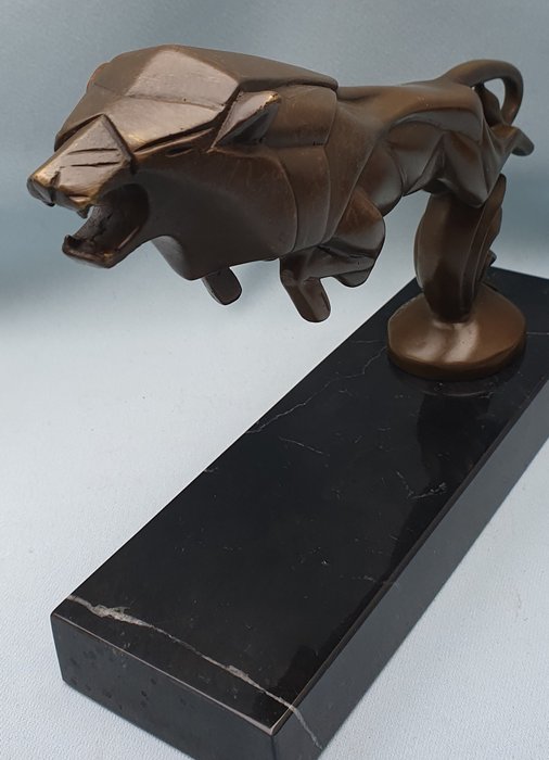 Bronzen Leeuw op marmeren sokkel in Art Deco stijl.