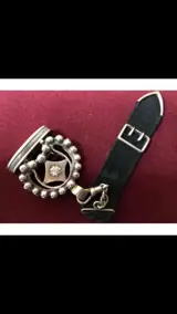 een typisch antiek Nederlands SIGNET / sieraad( zilver800 ) welke vroeger veelal werd gebruikt bij speciale gelegenheden en werd meestal gedragen samen met de meegeleverde zwarte band . Idem dito te gebruiken als alternatieve sieraad cq hanger aan bijvoorbeeld een zilveren ketting of aan het( gratis ) meegeleverdezwarte snoer .Geheel in goede staat / Afmetingzilveren .sec : 30 x 30 mm /incl. zwarte band lengte : 12 cm/ lengte zwarte veter / snoer: 34 cm /het geheel wordt geleverd inclusief juweliers cassette , aangetekend en verzekerd verzonden.
