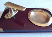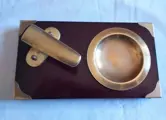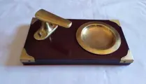 Matroos asbak blaker met massief messing noray gegoten in zand en gepolijst op een houten paneel, de noray wordt gebruikt om de ligplaatsen van schepen vast te zetten.