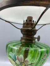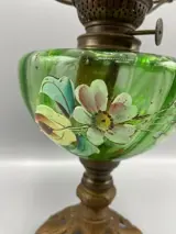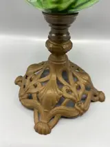 Antieke olielamp met gietijzeren voet en mooi beschilderd glas hij is 45 cm hoog en de voetmaat is 13 bij 13 cm hij word zeer goed verpakt en aangetekend verstuurd