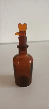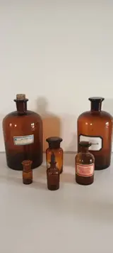 Collectie van 6 bruin glas oude apothekerspotten waarvan enkele met origineel opschrift van het medicijn met vermelding van de apotheek.De hoogte is aflopend van 30 cm. naar 8 cm.