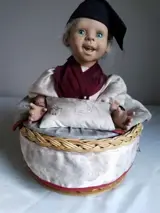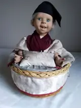 Zeer mooie oude rieten naaidoos in de vorm van een pop.