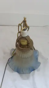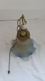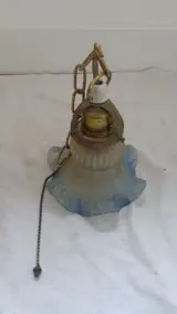 Oude plafonnière met een lichtblauwe glazen kap, waarschijnlijk van rond 1900
