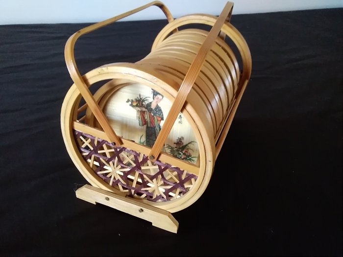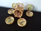 Zeer mooie displaystandaard en onderzetters in stro met Aziatische invloeden.