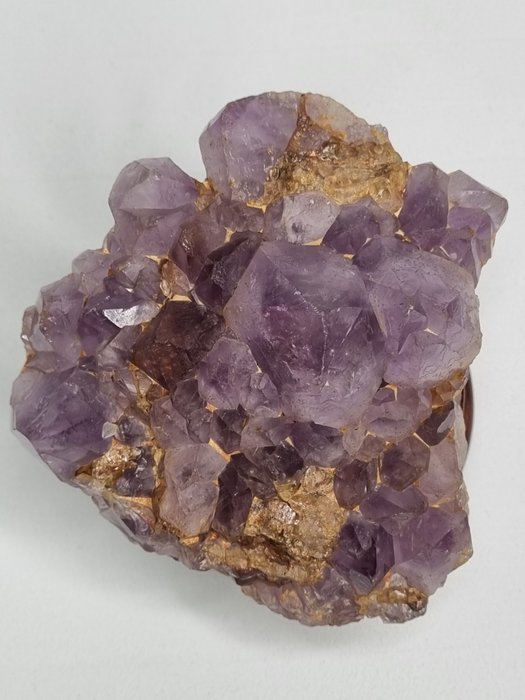 Druzen van kristallen op matrix, amethist en een ander kristal geïdentificeerd als calciet (of een ander kristal dat er op lijkt).
