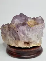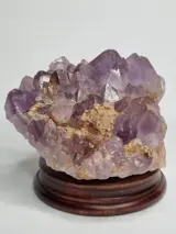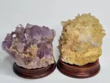 De twee kristallen zijn bevestigd op een ronde houten voet. Ze zijn allebei ongeveer 12 cm lang.