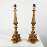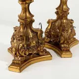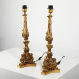 Paar fakkelhouders van synthetisch materiaal dat verguld snijwerk nabootst met plantmotieven. Hoogte 60cm. In goede staat.